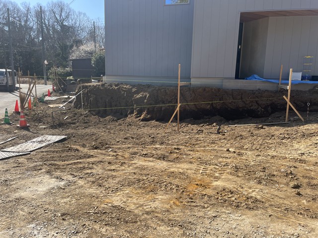 鋤取り作業が終わったので、駐車場&アプローチの勾配を出してもらったら