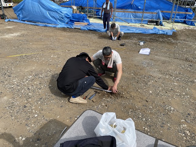 早朝から地縄をやっているのですが、大工Yさん手伝ってくれて