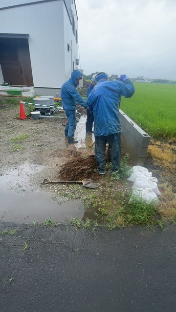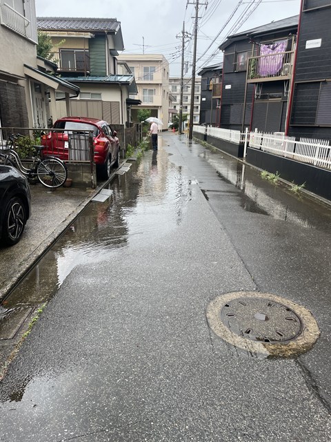 道路のU字溝が詰まっとんねん。