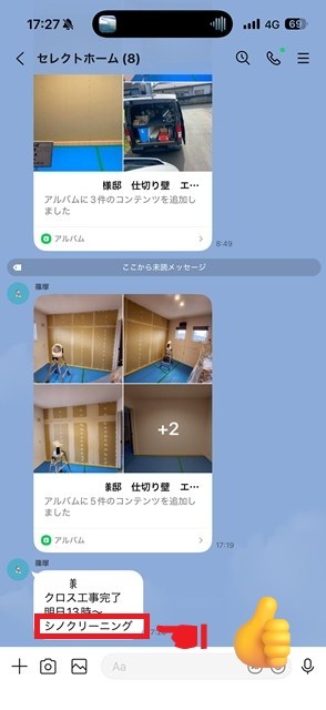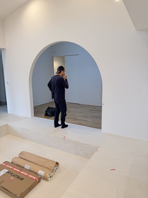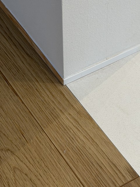 こういう、巾木の貼り分けも細かくワタクシに確認して対応する大工Yさん。