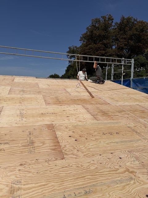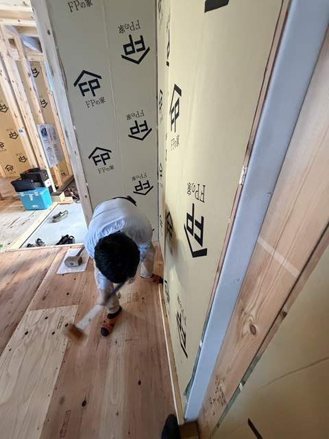 ちょうど大工さんたちが野地板張り終わったところだわ。