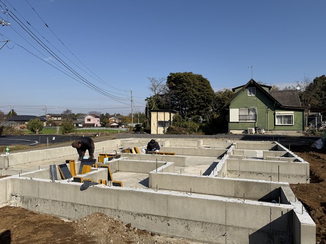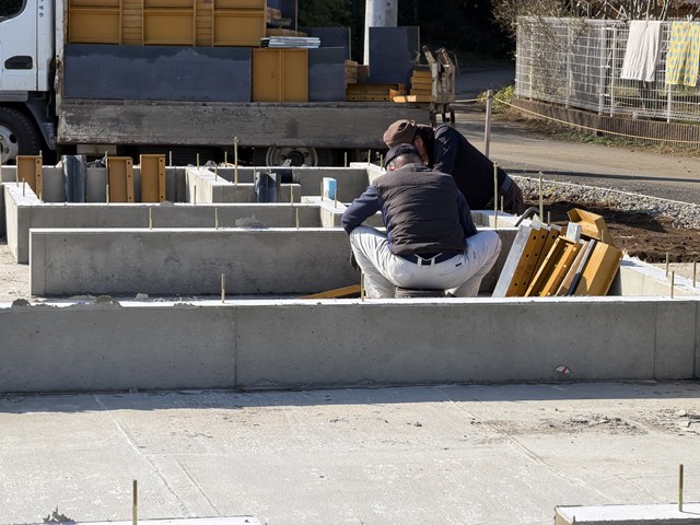 大工さんと隣のS様邸で基礎工事やっているFさん、そして枠バラシの手伝いに来てくださっている