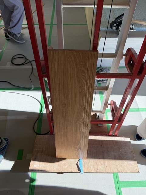 S様邸のおまけですがぁ~階段材が北海道から届いてたので、大工Yさんに1枚だけ梱包を開けてもらいました♪