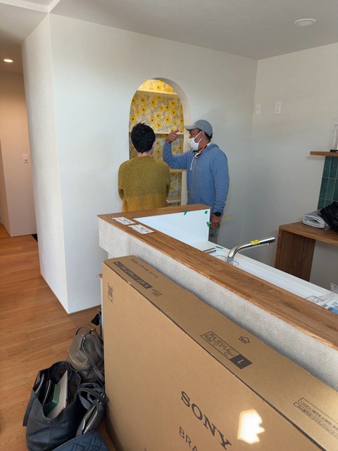 TVボードのカウンター巾ハギ材が入ったのでTさんが組んでいるのを見学したりぃ~