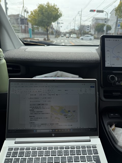 助手席でPCカタカタと来月の宿泊ご案内状を作成できたり