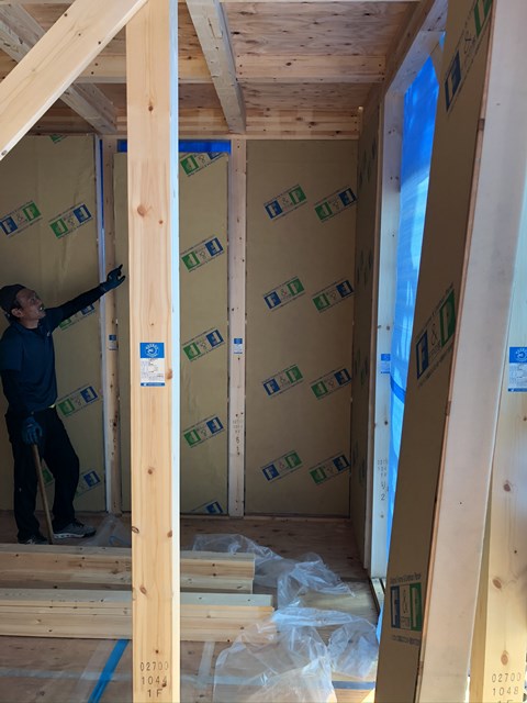 こんな感じぃ~♪桁や梁の接合部は気密テープでしっかり気密性を高めますのよ🤩