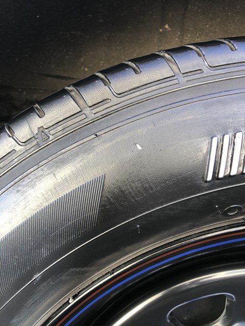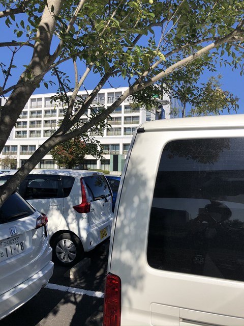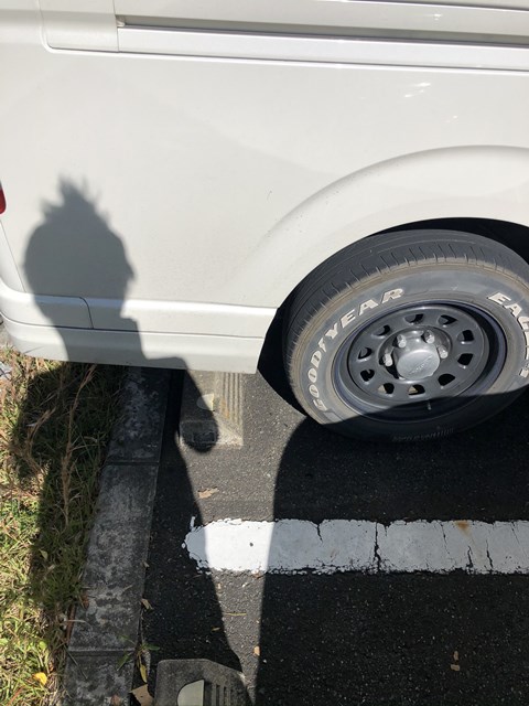駐車する時ね、嫌な予感がして車輪止めより手前で止めたの。この位☞
