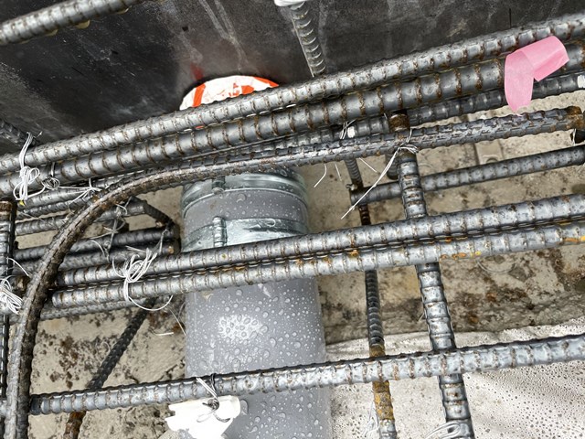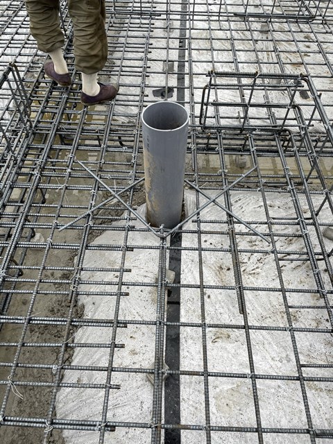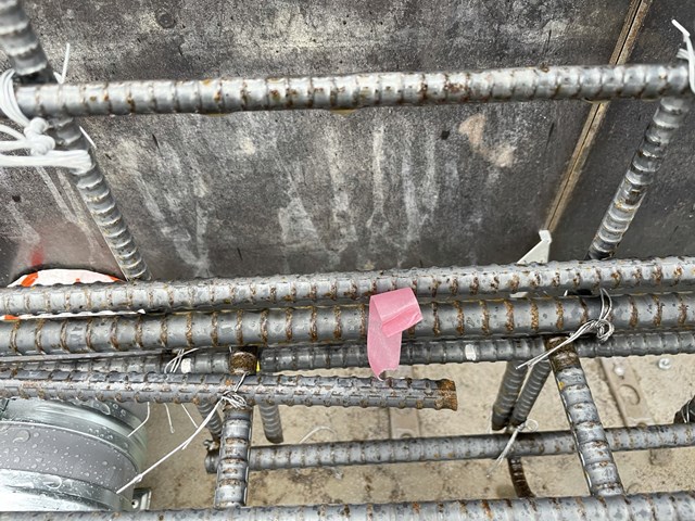 設備屋さんが、ピンクテープ貼ってる鉄筋を補強筋で入れた事により