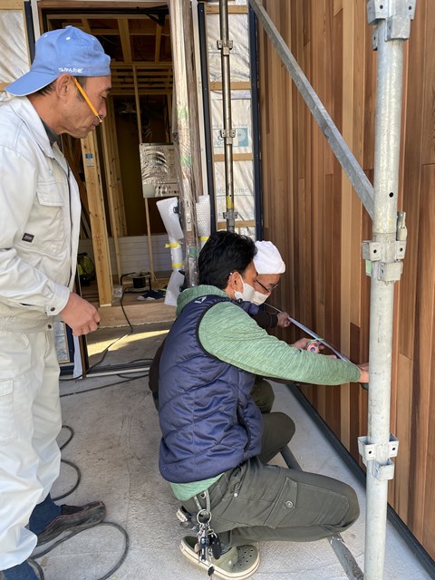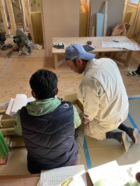 みんなメッチャ真剣です。。。だって、天然木張ってあるから失敗許されませんので😎