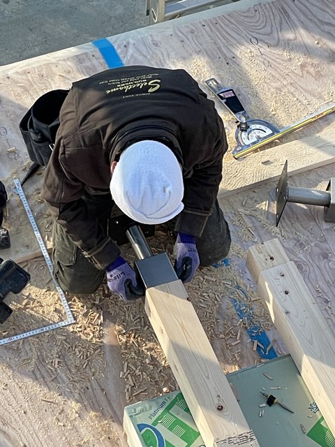 Oさんが削ってる柱は外部で使うヒノキ無垢柱でして