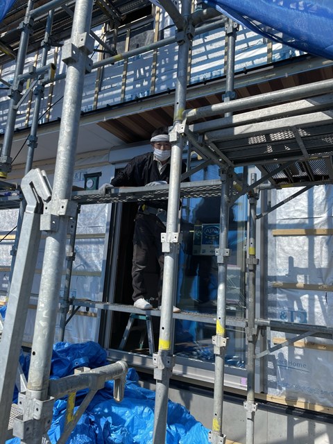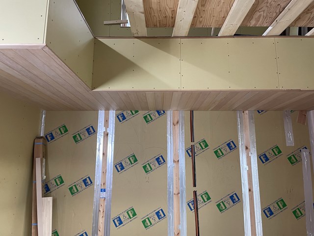 O様邸は軒天にレッドシダー張る仕様なんですけど、防火のケイカル板張ってからの施工で無いと