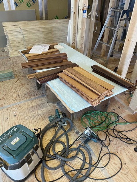 大工Kさん気合入れて軒天レッドシダー張ってた。