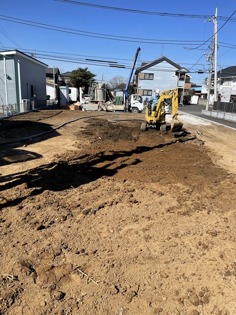 杭打ち終わったところはユンボで均してます。