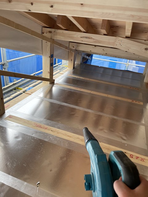 ブロアーで小屋裏のゴミやホコリを飛ばしてキレイにしてます✨