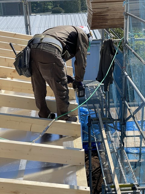 ではなくー、野地板を垂木にくぎ打ち機で留めて行くんですけど