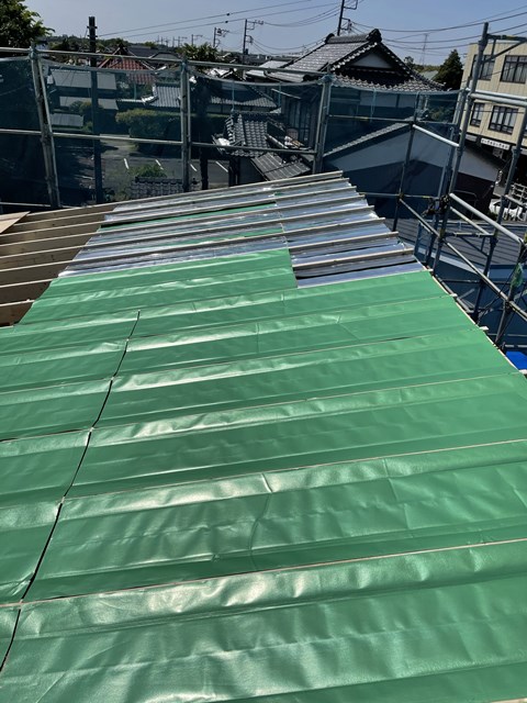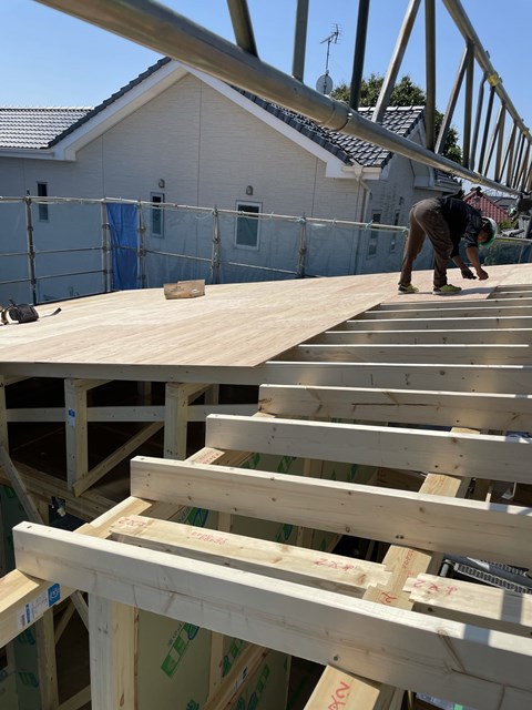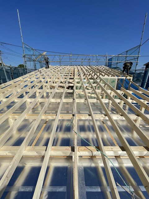 天井断熱部分は野地板を施工していきます~。