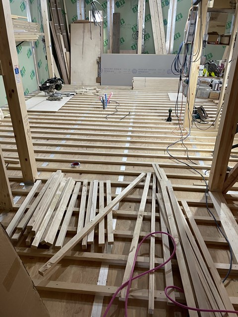 S様邸は、大工Yさんが床暖の下地を施工してるーるるるぅ~。