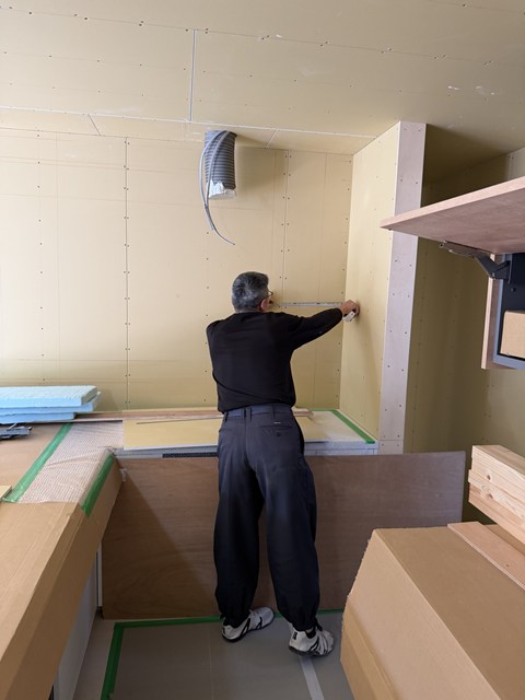 K様邸では、ワタクシが大工Yさんからキッチンパネルのプレゼンを受けておりますぅ~。