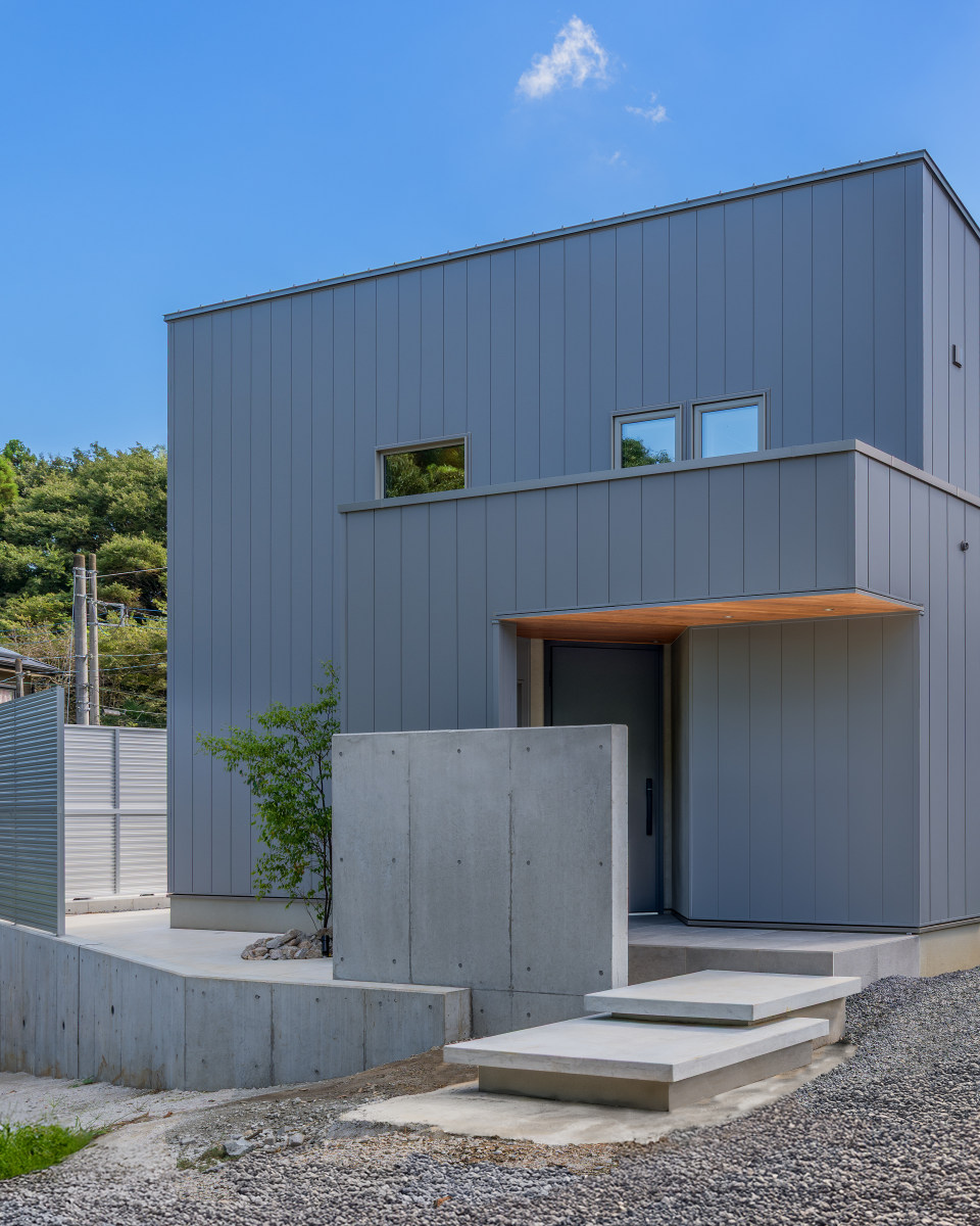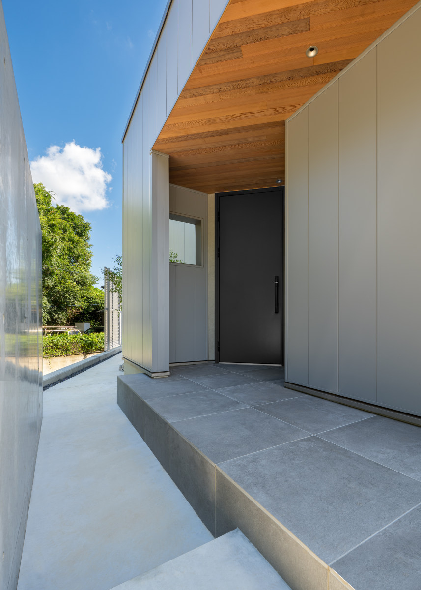 玄関ポーチの軒天には木をあしらい、硬質な外観に一瞬のやわらかさを添えました。