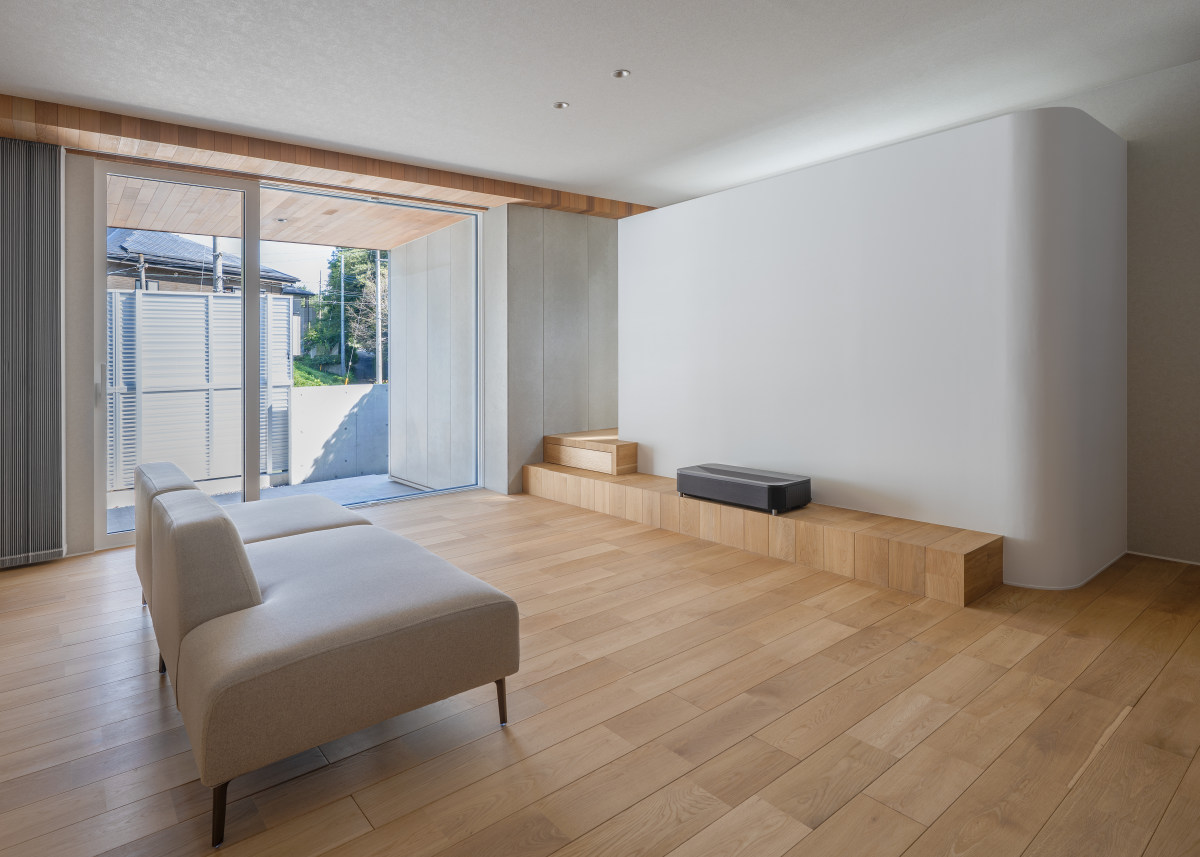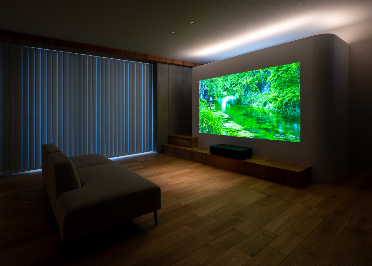 装飾を極力削ぎ落としながらも、映像投影に対応したプロジェクターや間接照明、天然木のステップなど、機能と意匠を両立させた設計です。