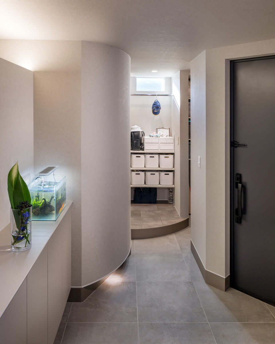 この住まいの大きな特徴のひとつが、玄関ホールから伸びるR(曲線)壁。