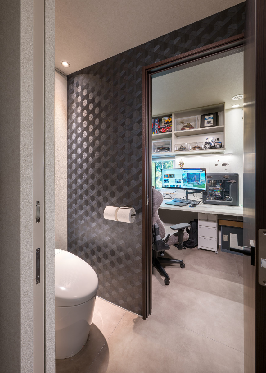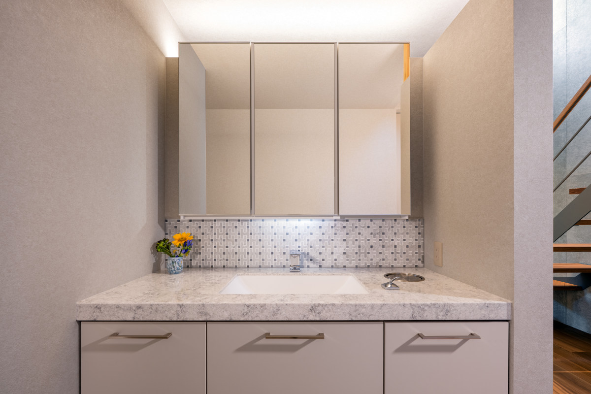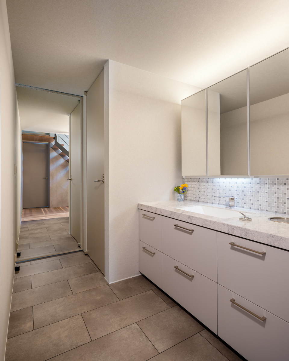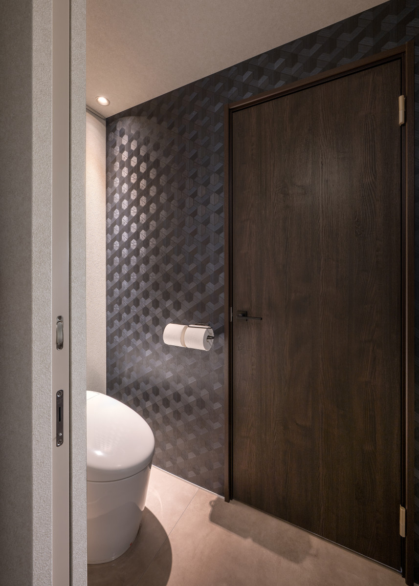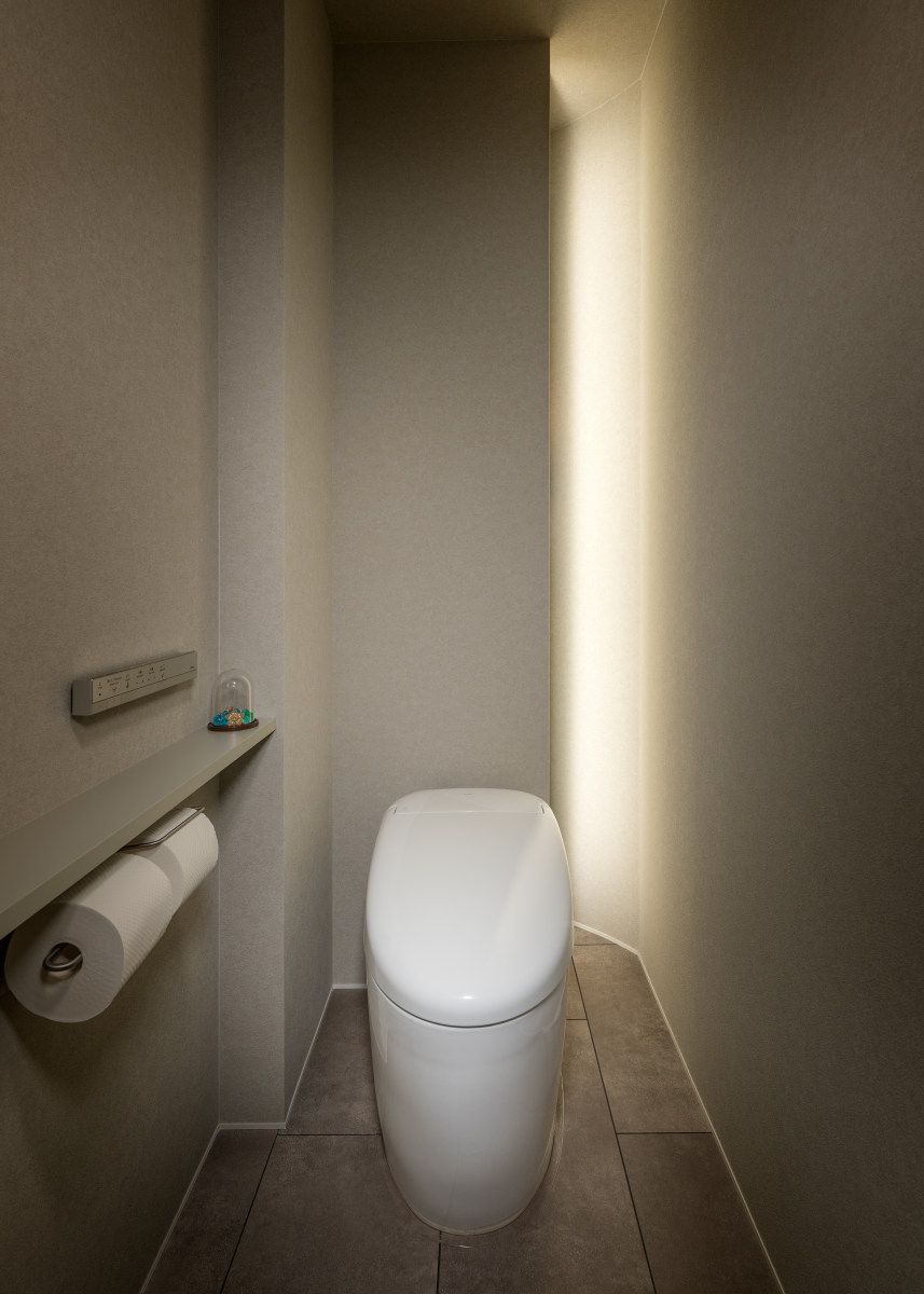 洗面台まわりやトイレにも質感の異なるタイルや間接照明をあしらい、細部にまで抜かりないデザインが暮らしの質をそっと引き上げてくれます。