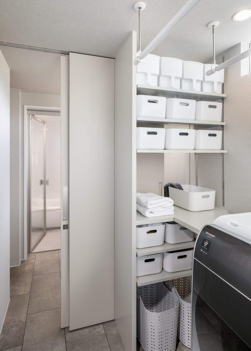 さらにランドリールームには造作棚と大量の収納ボックスを設け、見せない収納と使いやすさを高いレベルで両立しています。